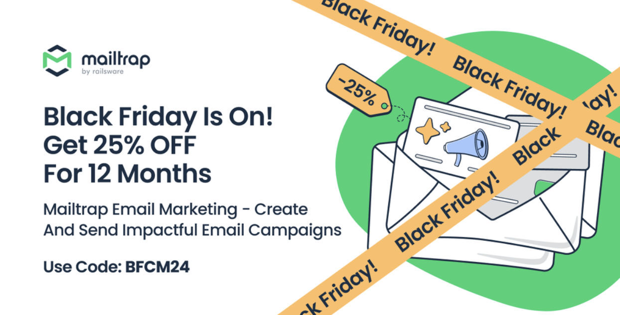 Black Friday deal: 25% off on Mailtrap Email Marketing for 12 months, Sending Basic and Business plans. The offer can be activated until 31.12.24. Promo code: BFCM24.