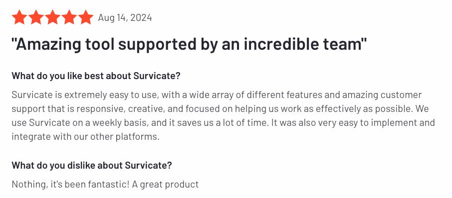 Survicate continually receives praise from customers and third-party review sites for ease of use and ease of implementation. There are also 400+ templates designed to boost survey completion rates. You can find tutorials and guides on our YouTube channel and Help Center. We also have human, live chat support with an average response time of 2 minutes.